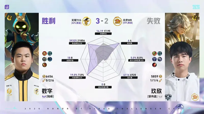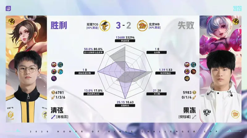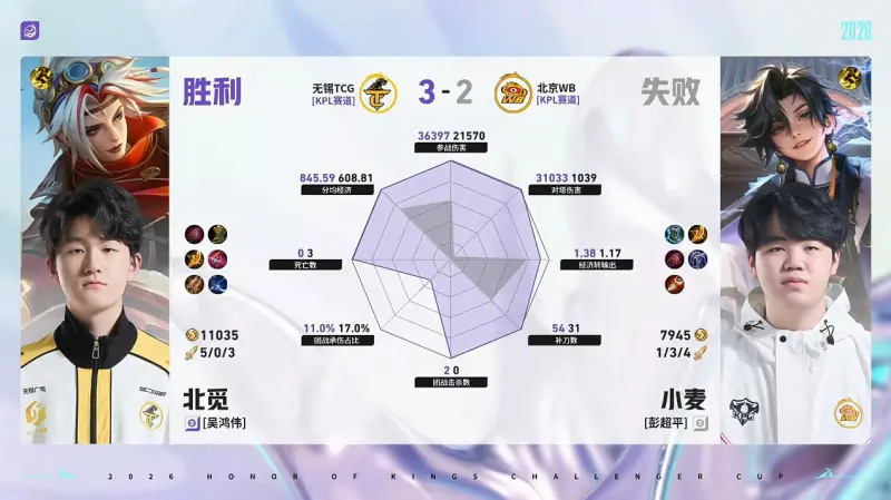虎扑04月26日讯 TCG/WB第5局数据对比:北觅戈娅全包围小麦孙权。